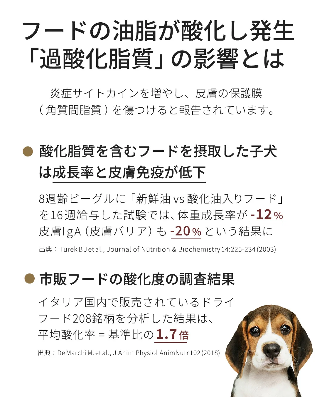 フード中の脂質がアルデヒド類などの酸化生成物に変わり、栄養価や風味が損なわれます。さらに、それらを摂取すると体内ではビタミンEなどの抗酸化成分が余分に消費されやすくなり、愛犬のコンディションを乱す一因になると報告されています。